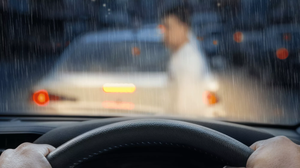 View from inside a car during heavy rain as a person stands near a vehicle ahead after a crash, immediately calling a portland hit and run lawyer.